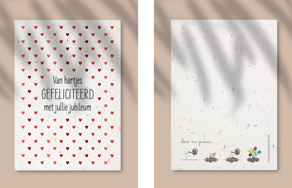 wenskaart groeipapier ‘Van hartjes gefeliciteerd’.